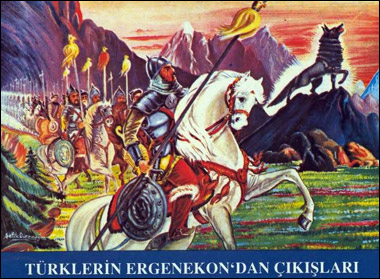 L’utilisation des thèmes légendaires ou historiques de la haute Asie commence par la légende d’Ergenekon. Ce terme désigne le lieu mythique qui serait le lieu d’origine des Turcs célestes, situé quelque part dans les monts Khangaï où se trouve la source de l’Orkhon. La légende ressemble à celle de Romulus et Remus : l’ancêtre des Turcs célestes serait un enfant, seul survivant d’un groupe de proto-Turcs, abandonné dans ce lieu d’Ergenekon, qui aurait été recueilli et nourri par une louve. Le « peuple turc » une fois reconstitué à partir de cette renaissance miraculeuse, aurait établi là une première civilisation, domestiqué le feu, découvert l’art de forger. A partir de ce lieu d’Ergenekon, les Turcs célestes auraient essaimé, fondant notamment « l’empire des Turcs célestes » qui aurait contrôlé une grande partie de l’Asie intérieure. Le feu, le fer, la forge, le loup sont les ingrédients de la légende. Au début de la république (1923) la louve ou le loup (il n’y a pas de genre en turc) a servi de symbole du nouveau régime ; il renvoyait à la légende d’Ergenekon en évoquant le « foyer originel » d’Asie centrale, et contribuait à enraciner la république dans un passé öztürk, « purement turc » [4]. Lors de l’interdiction, sous Atatürk, de toute expression du panturquisme, celui-ci a dû se marginaliser et s’est radicalisé. L’image du loup a alors cessé d’être un symbole officiel pour être confisquée par l’extrême-droite, et utilisée par des revues extrémistes.